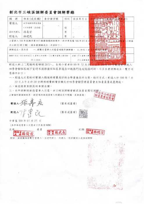 99年12月3日車輛毀損出口大門賠償案,經三峽區公所1月21日調解成立,肇事人賠付15000元,本委員會抵付修復費用4000元。
