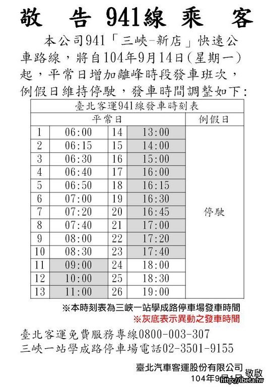 台北汽車客運公司941「三峽-新店」快速公車路線,將自104年9月14日(星期一)起,平常日增加離峰時段發車班次,例假日維持停駛,發車時刻表如下,歡迎乘客多加利用。