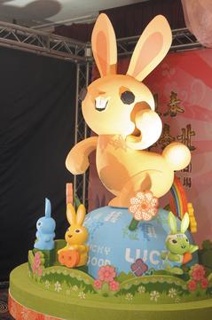 今年台北燈節主燈昨天亮相。台北市政府打造名為「貝比」的大型兔年造型燈,象徵源源不絕的好運(孕)。今年主燈下方獨創情境互動區,民眾只要在感應區內做出「拜拜」、「揮手」等動作,畫面上將出現即時影像,給民眾不同的賞燈體驗。