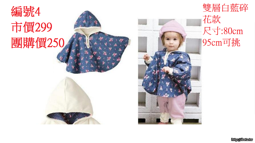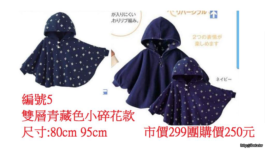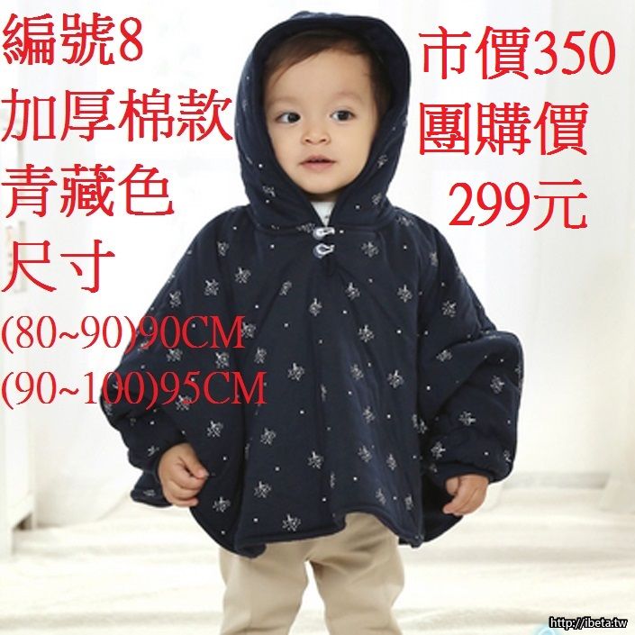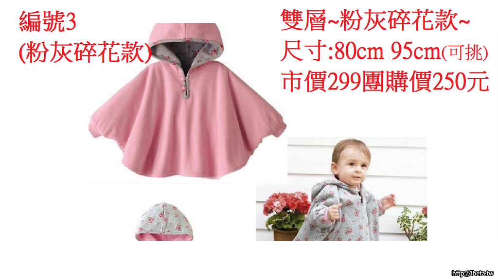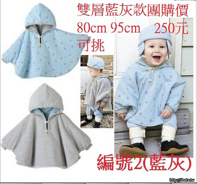 (一)0~3歲雙面披風/加厚款 雙面款市價299元團購價250元 加厚款市價350元團購價299元
