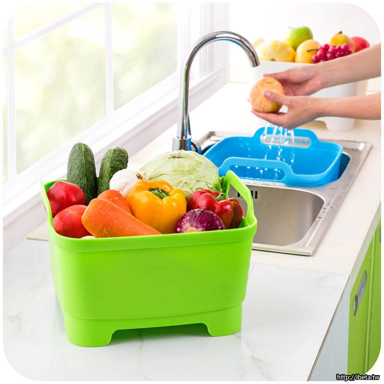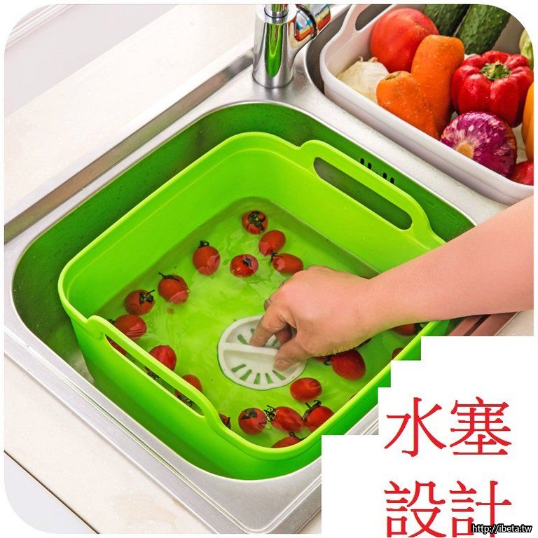 當家中廚房洗水槽空間不夠用時好幫手~清洗和濾水二合一,他不單是一個蔬果清洗藍.底部加入水塞設計.可弄至放水