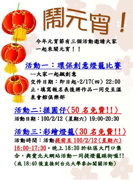 今年元宵節有三項活動可以讓大家鬧元宵。