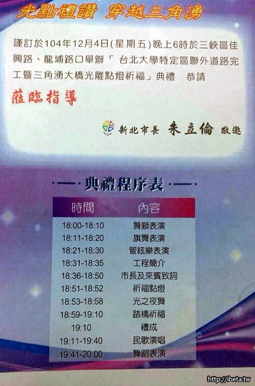 (記者黃秀麗新北報導)台北大學特定區聯外道路 5 日起開放通車!新北市政府於 12 月 4 日晚間舉行完工通車典禮,並為此聯外道路最重要的橋梁三角湧大橋進行光雕點燈儀式,光彩奪目絢麗耀眼的的三角湧大橋,在新北市府副市長侯友宜和各界民眾數百人的共同見證之下點亮,剎那間躍升成三峽地區新地標。
