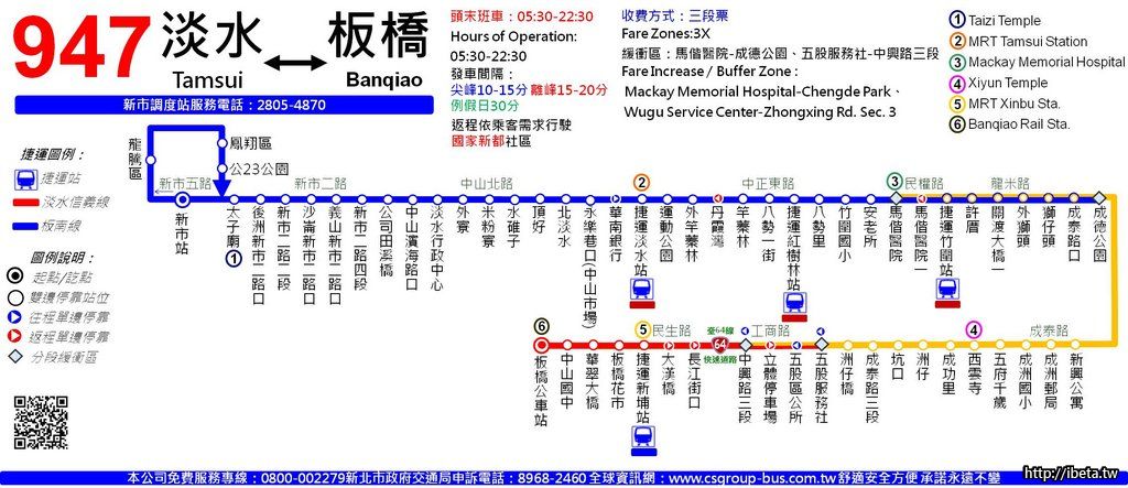 轉搭947公車,走台64,到捷運淡水站,三段票,約40分鐘