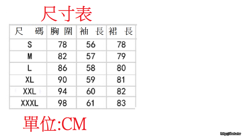 XXL:肩寬40CM 胸圍:96CM 衣長:82CM 袖長:61CM (建議體重:62~69公斤)