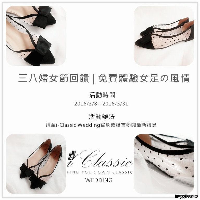 4. 逐一完成以上3個步驟就可免費獲得i-Classic高級訂製手工美鞋婚鞋裸蕾絲NO.7平底鞋(訂價NTD5000),讓您體驗最美麗女足風情,感受i-Classic"婚禮生活化&美學精緻化"迷人魅力!