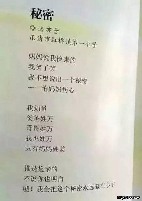 每當小孩詢問「我從哪裡來的」之類的問題,父母經常會因為懶得解釋,而回答「你是撿來的」等答案,讓孩童為此感到悶悶不樂及困惑。而大陸網路上近日瘋傳小學女童創作的詩,內容既保有童真,更藏有對媽媽的愛,讓人忍不住會心一笑。