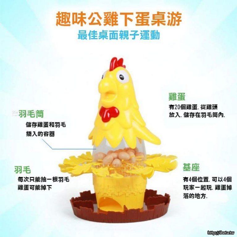 配件:雞蛋*20 , 羽毛*30 , 羽毛筒上部*1 , 羽毛筒下部*1 , 基座*1 雞頭*1