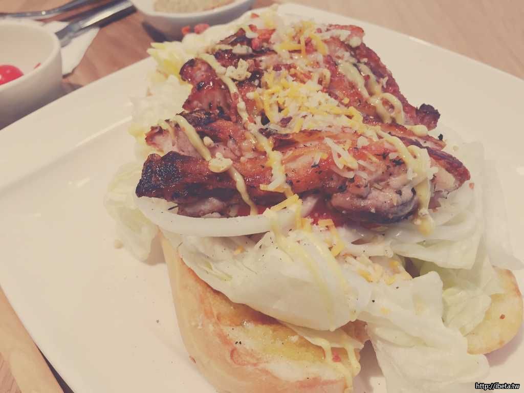 雞肉班尼克蛋,外面的麵包是佛卡夏,有花草香氣,加上蛋液跟香煎雞肉、蔬菜融合,很爽口