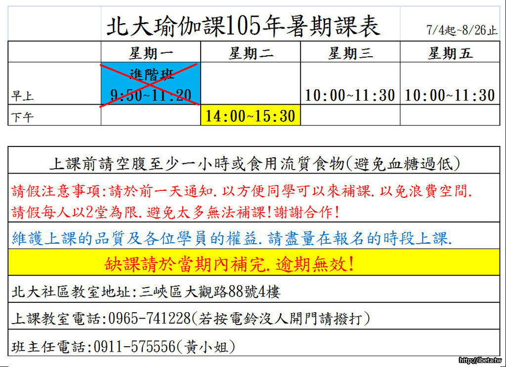 萍心瑜伽教室 發表於 2016-6-25 23:50 你好~9月份開學後(秋季班)的班要8月開始招生.請密切注意!名額限制8人(小班制). 電話:2672-4051.0917-6900 ...