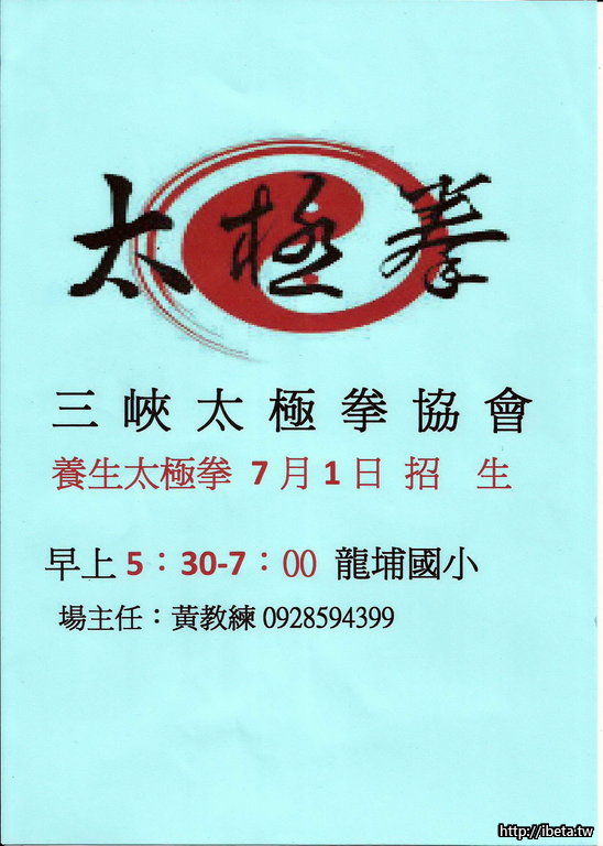 新北市三峽區太極拳協會龍埔教練場日班,即將於2016年7月1日開班,歡迎有興趣的同好一起加入學習太極拳的陣容,並請把握這次的開班良機,本場係由本協會的總教練在場傳授指導。