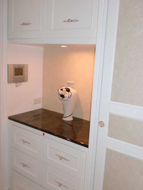 進玄關右側鞋櫃 : 這張圖只有顯示鞋櫃後半部, 包括上下櫃以及端景台, 另一半靠門口的前半部是抽拉式鞋櫃以及衣帽櫃, 因為深度超過80cm以上, 為避免浪費空間, 鞋櫃改用抽拉式的, 可以看一下上面變化圖上有稍微拉一點出來, 軌道五金件就有80cm長, 分上下二層.