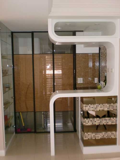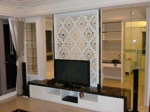 另一頭的電視牆 : 原本電視牆想擺在現在的沙發背那裏, 但是設計師偏好電視牆設計在書房跟客廳的隔間, 後來覺得這主意不錯就沿用, 電視牆的雕花版就我當時知所, 同一棟就有三四戶用同一塊花紋, 不過看來看去還是這花紋比較好看. 電視櫃上喇叭的線當時還沒拉好, 不過現在拉好了.