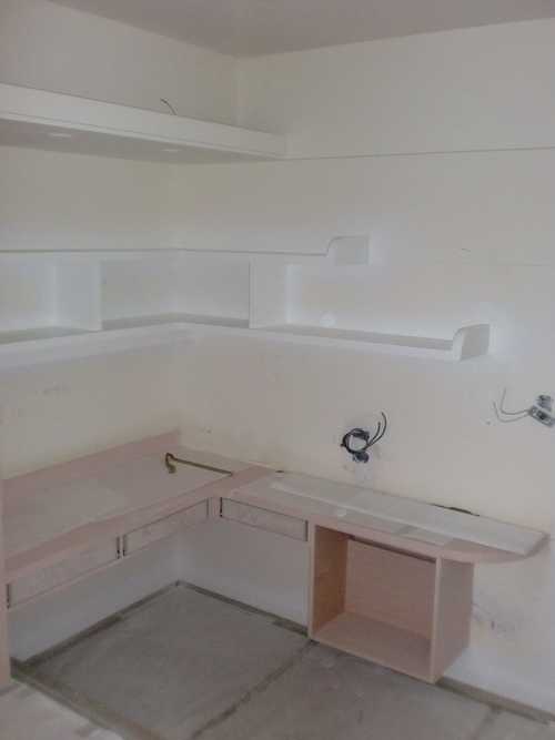 固定式書桌 : 椅子還沒買, 這書桌原本是磚牆, 書桌後面是兒子的房間, 原本鐵雄規劃的書房空間太小, 兒子的房間太大不符我們的需求, 後來設計師建議打掉磚牆, 以書桌書櫃來當隔間, 解決我們的困擾. 書桌前事先貼上跟客廳一樣的壁紙再加上清玻, 不過客廳跟其他地方是用直貼, 書桌前是用橫貼, 視覺上比較寬敞, 色系又搭的上.