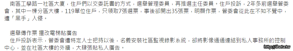 [backcolor=Yellow]近來有心人開始視公寓大廈管委會為大餅,利用組織滲透管委會,勾結管理顧問公司、社區總幹事等,收取管理費回扣,並在修繕的時候,圖利特定廠商,大汙公款。