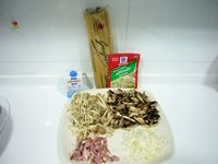 * 過年剩的臘肉切碎 先下鍋逼出油 然後放大蒜 洋蔥 蘑菇 白靈菇 等水分都出來 加入牛奶跟義大利麵醬包(超市有售)