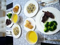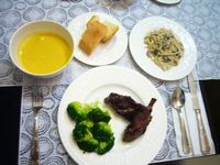 成品上桌 麵包是布斯特的名太子法國麵包 鹹鹹酥酥的 配有點甜味的南瓜湯 絕配喔!!