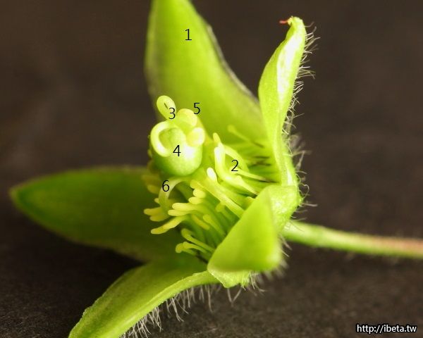雌雄蕊柄先端為圓球狀,這是子房,在子房上面有三枚雌蕊。