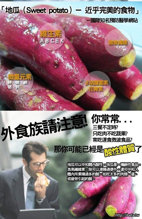 地瓜含有纖維素、鈣質、葉酸、鉀、胡蘿蔔素、維生素C等營養成份,熱量低又富有飽足感,絕對是您健康養生的食材首選!連皮一起吃最能攝取營養成分喔!