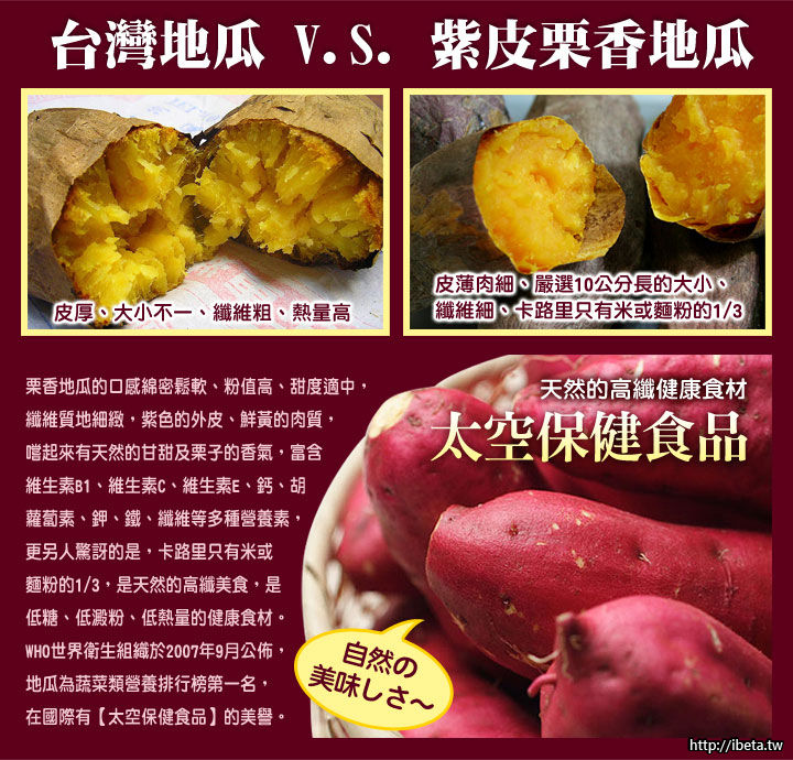 日本超人氣的美味品種!生長在海拔1000公尺以上的高原上,環境天然安全無汙染,每個地瓜都飽滿結實。外表披著絢麗的紫色外衣,裡面是奶油色的甜蜜口感,一口咬下,栗子獨有的香氣不斷誘惑著味蕾,保證讓您一吃就上癮!