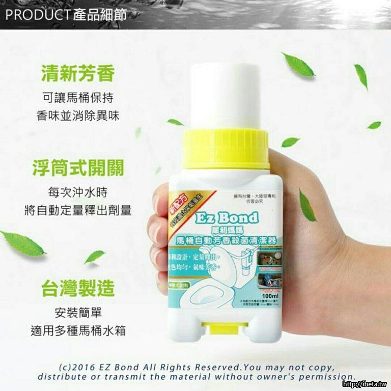 沖水時自動清潔馬桶,專利浮筒開關,自動調節出液量『可連續使用200-300次』大約可以使用一個月