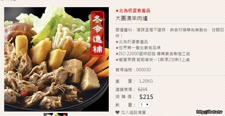 內容物: 大圓滿羊肉爐(奶蛋素)