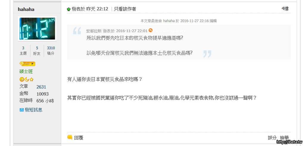 hahaha 發表於 2016-11-28 00:02 你可以貼個文來證明民進黨逼你去日本買核災食品吃嗎?