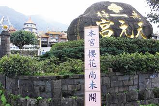 賞櫻勝地淡水無極天元宮的櫻花含苞待放,令興沖沖遊客失望,因此宮前特地立牌告知。