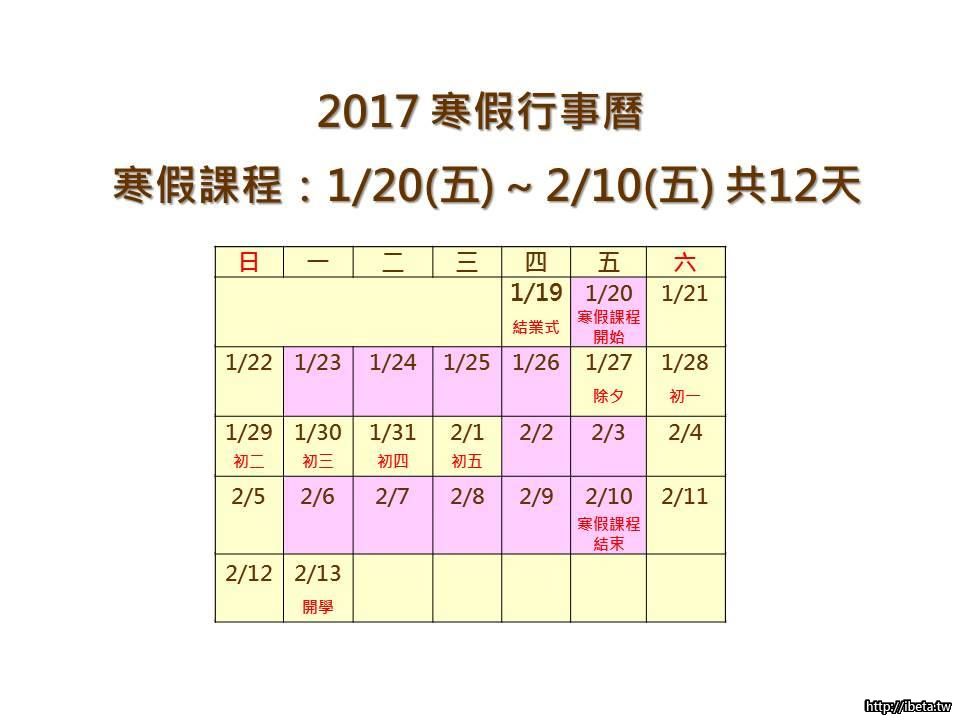 2017寒假課程行事曆