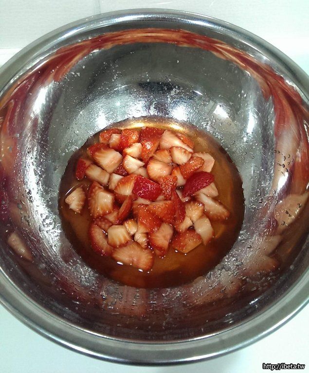 1.新鮮草莓洗淨後,去蒂頭切小塊狀放入盆中,