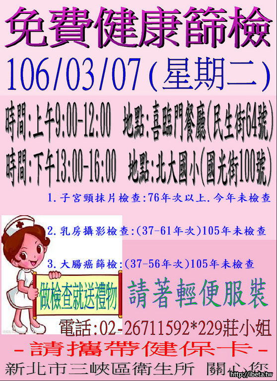 3月7日(二)三峽衛生所社區癌症篩檢-喜臨門、北大國小