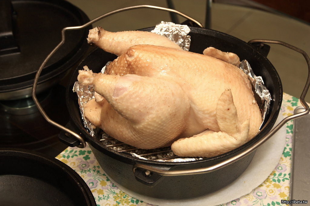 再以層網墊高放雞, 雞大鍋小, 10吋鍋勉強放得下!