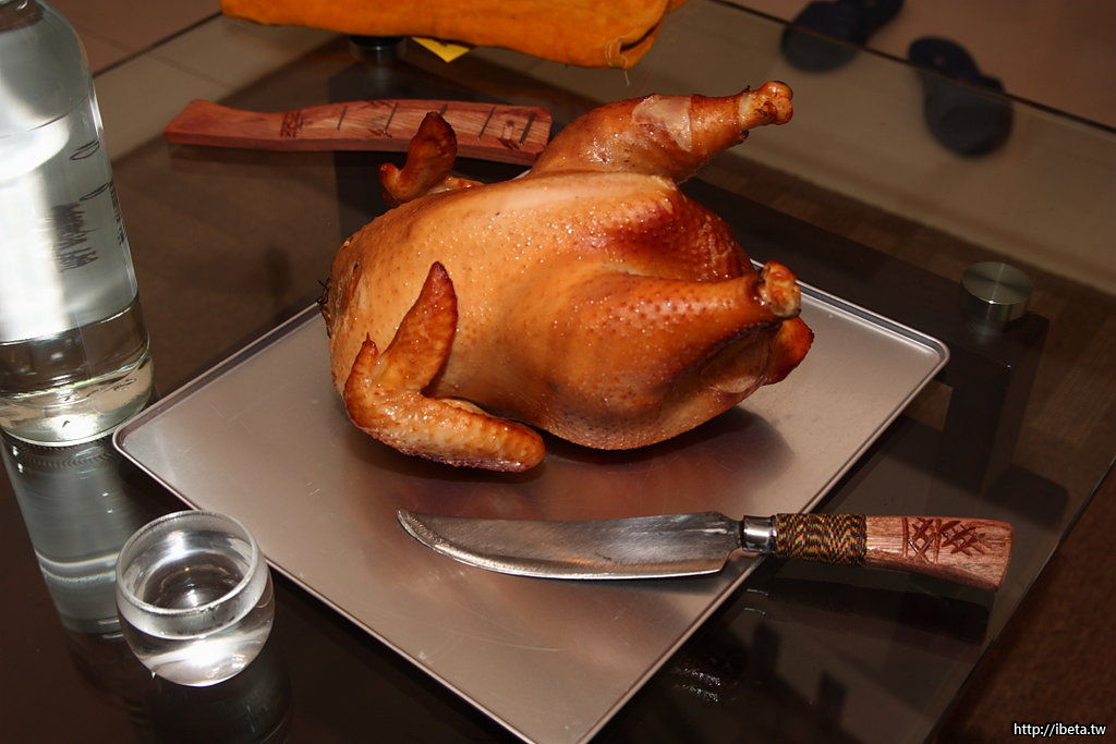水煮八分熟的雞, 並不用烤太久, 主要是煙燻