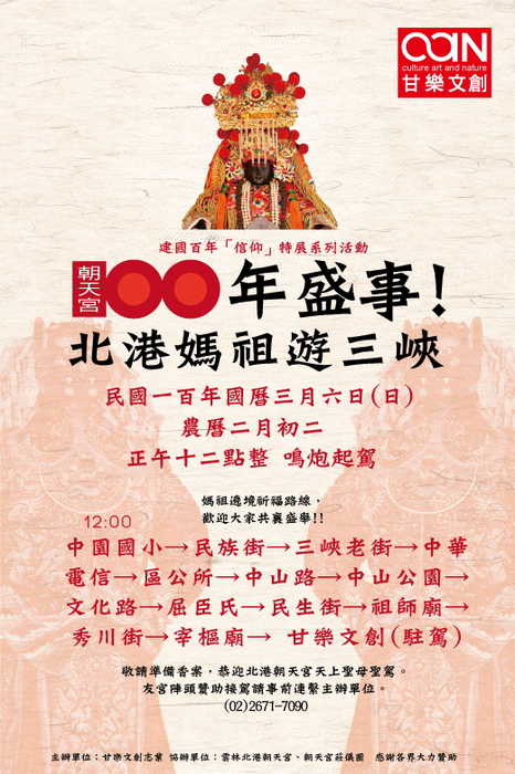 今年( 2011年)適逢建國百年,北港媽祖受三鶯青年志願服務團的邀請,打破以往的傳統,特別以文化展演型式舉辦『信仰』特展,並將在國曆的三月六日奉請北港朝天宮媽祖來到三峽舉辦繞境祈福活動。