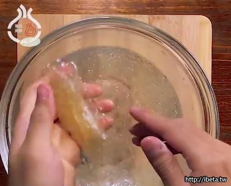 3.準備一盆冰水,放入吉利丁片浸泡5分鐘,擠乾水分