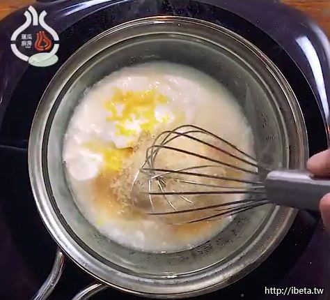 5.放入鮮奶油與吉利丁攪拌至滑順