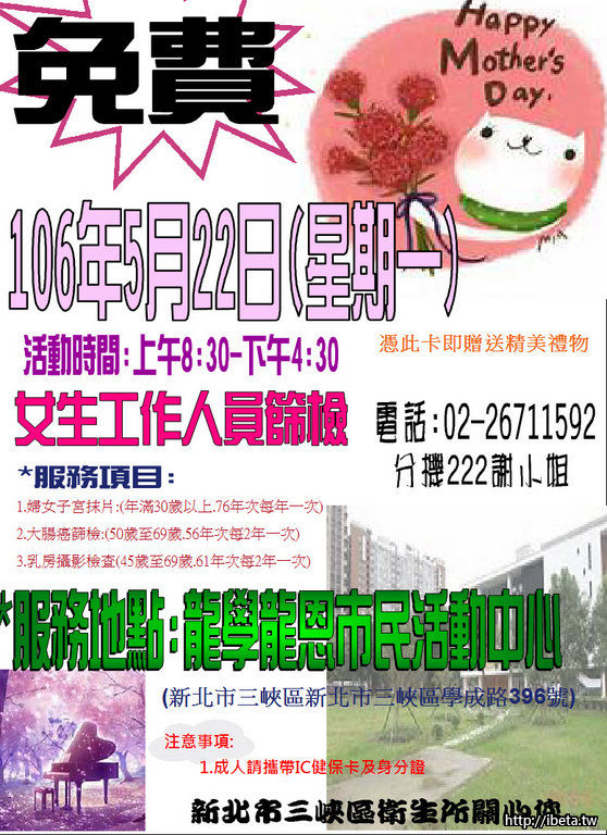 5/22(一)三峽衛生所免費健康篩檢-龍學龍恩活動中心