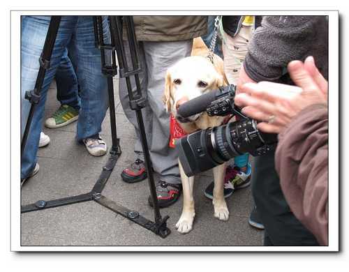 大家都拿著相機,手機,攝影機...圍著拍一個帶狗的人!