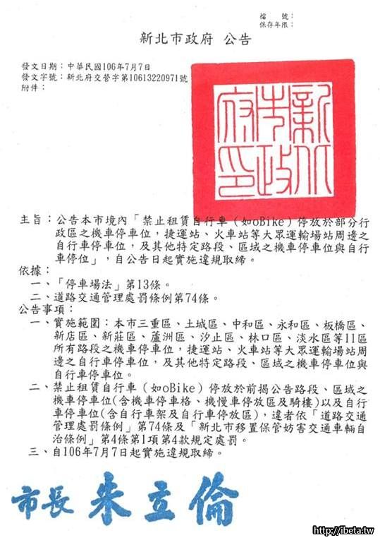 自今(106)年5月起oBike業者陸續將營業車輛大量投放本市境內,並衍生違規停車、占用機車停車位及自行車架等影響民眾停車秩序之問題,為有效規範停車秩序,避免業者營業行為影響民眾停車權益,新北市交通局公告「租賃自行車」禁止停車範圍,包含三重區、土城區、中和區、永和區、板橋區、新店區、新莊區、蘆洲區、淡水區、汐止區及林口區等11區之機車停車位;各捷運站、火車站等大眾運輸場站周邊之自行車停車位;以及其他特定路段、區域之機車、自行車停車位。公告自106年7月7日起生效,交通局提醒民眾,違反前揭公告事項,由警察局執法取締、移置違規車輛,並依道路交通管理處罰條例第74條規定,處新臺幣三百元以上六百元以下之罰鍰。