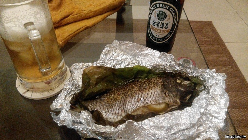 潮鯛洗淨,腹腔內塞入檸檬、蒜、薑。