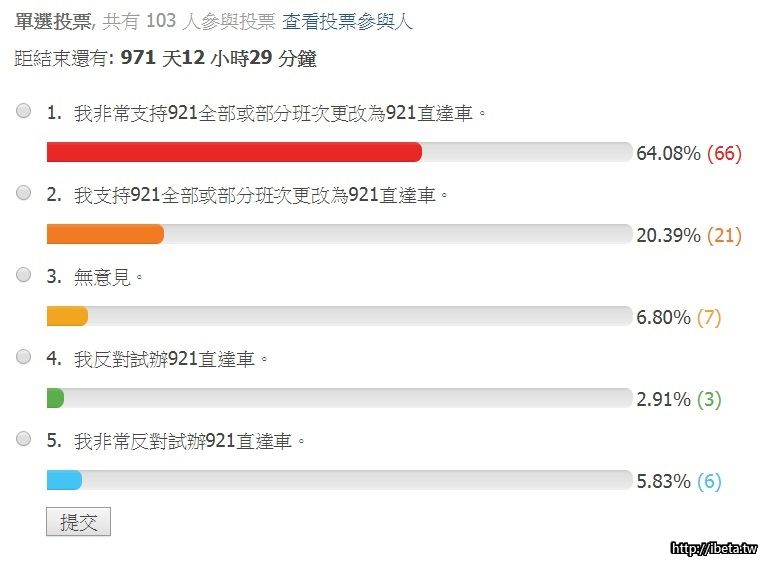 4.因為本投票攸關每一位投票人之權益,且[backcolor=yellow]不公開投票參與人[/backcolor],因此無論支持者或反對者都能依己意投票,透過此投票[backcolor=yellow]足以準確推測多數乘客希望試辦[/backcolor]921直達車。