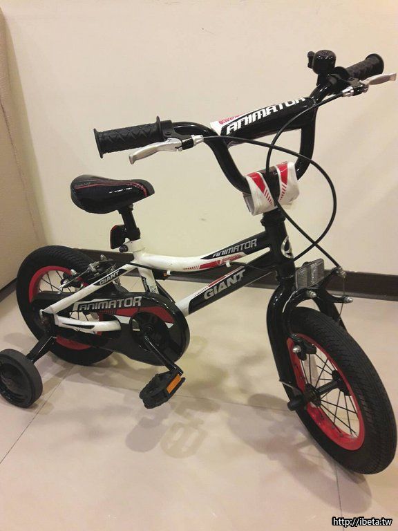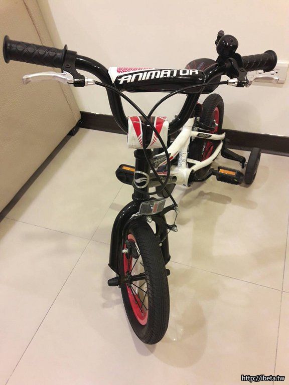 已將輔助輪裝上,有另附贈捷安特門市購買的腳架,等學會兩輪後拆了輔助輪可再安裝腳架好方便立著停車。