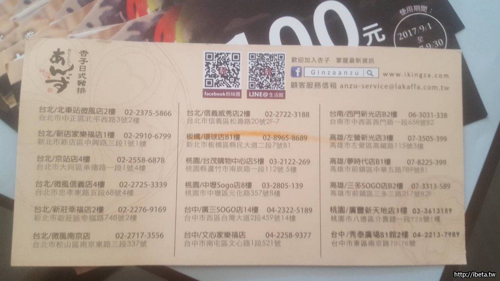 銀座杏子日式豬排NT100折價券,使用日期到2017/9/30止