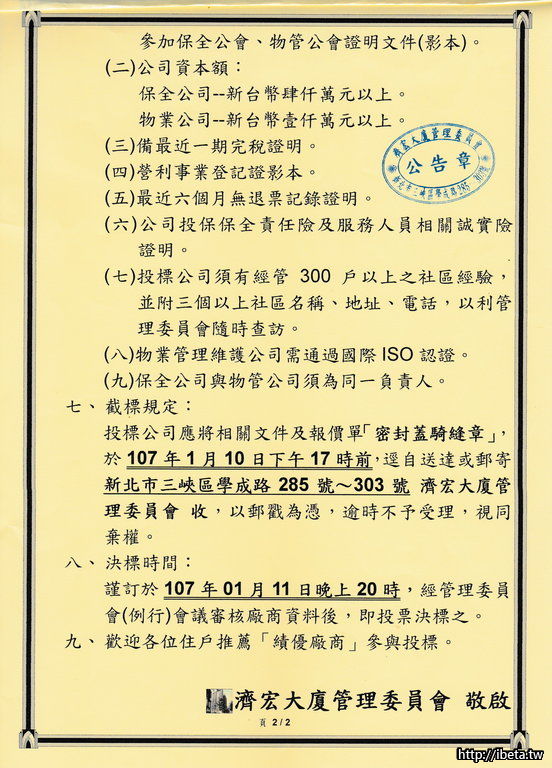 濟宏大廈-107年度物業暨保全維護合約招標案公告