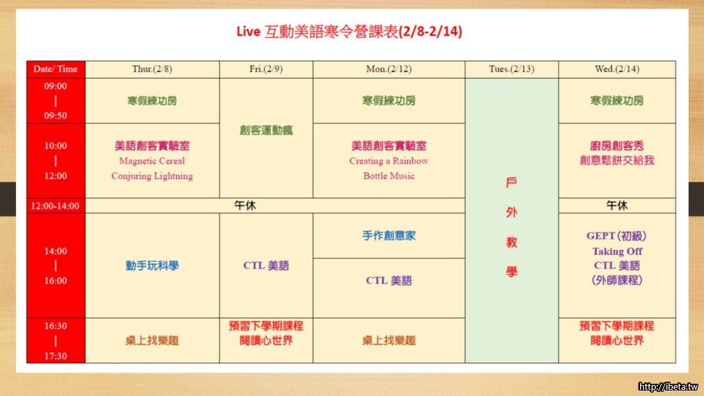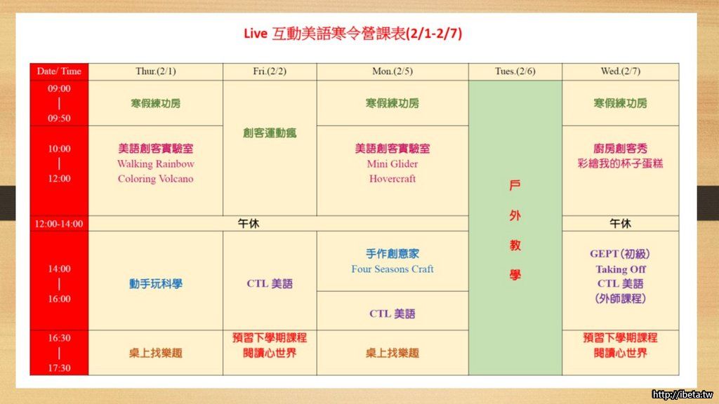 寒令營課表(1/25-2/14,共15日,可選擇單日課程)