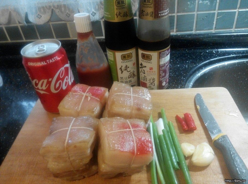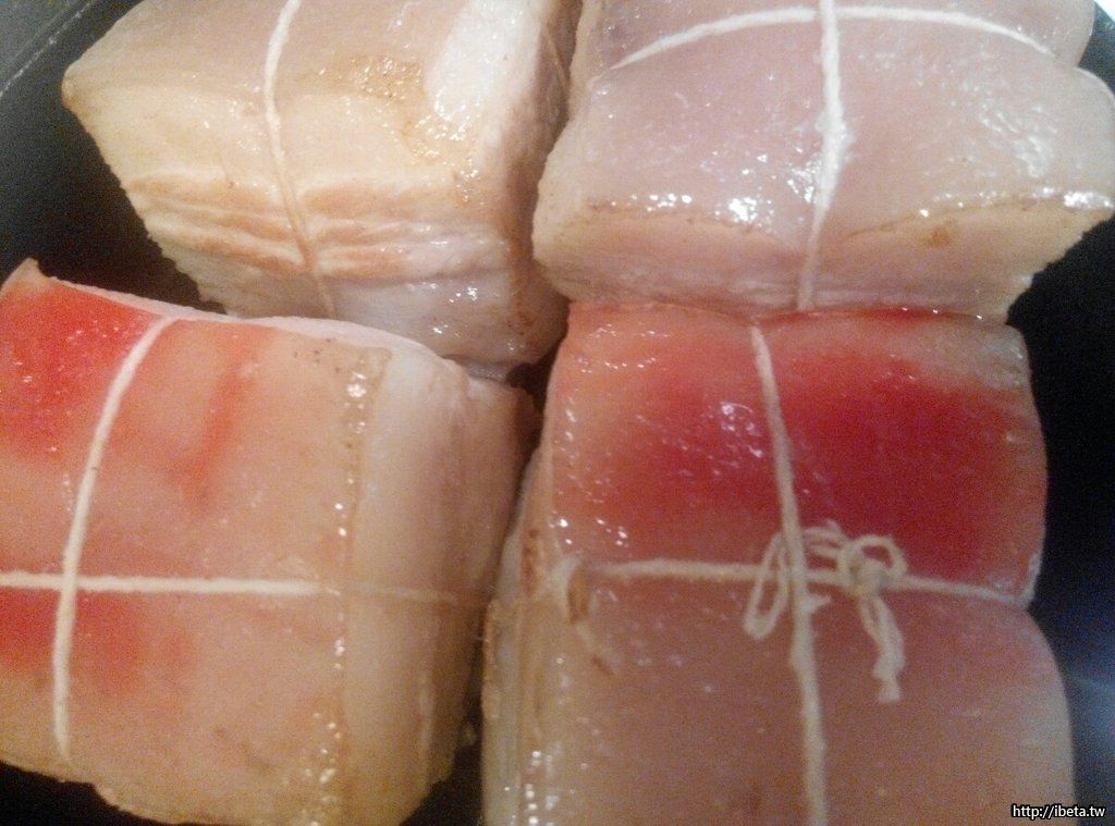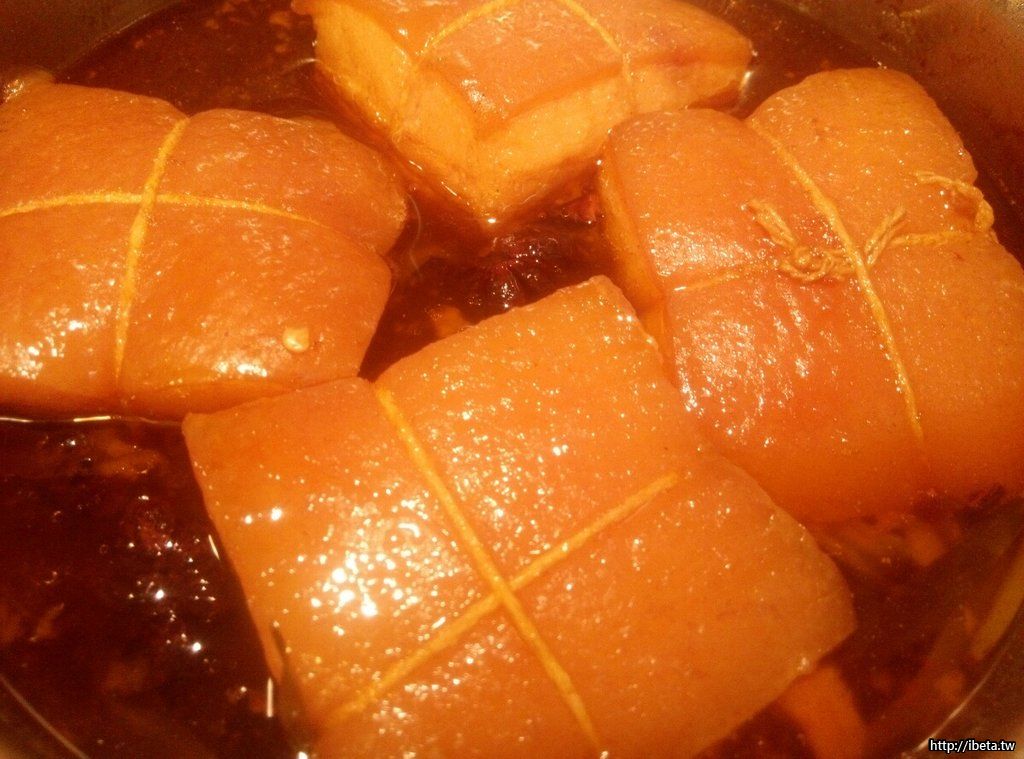 將肉塊豬皮朝下,移入鍋中。醬汁應淹滿肉塊高度,若有不足就補米酒或可樂。