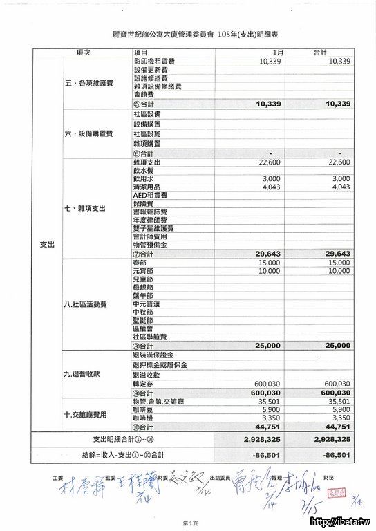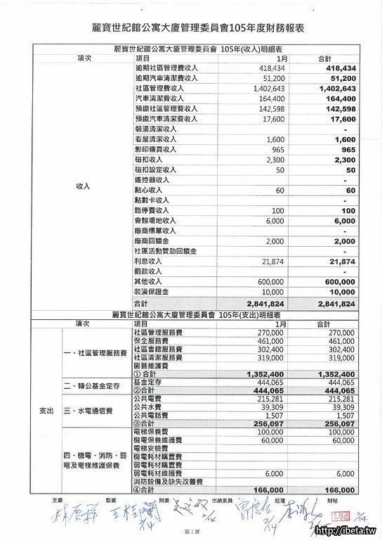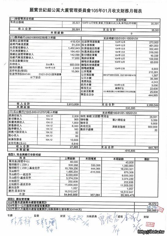 第六屆105-01收支月報表&105年度財務報表