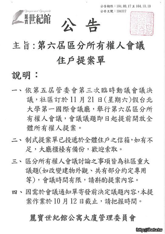 104117第六屆區分所有權人住戶提案單