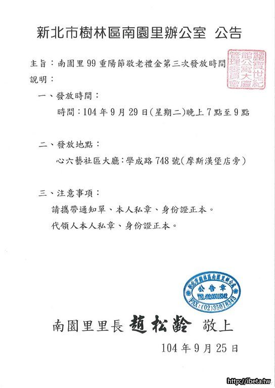 南園里里辦公處公告,重陽節敬老禮金第三次發放時間
