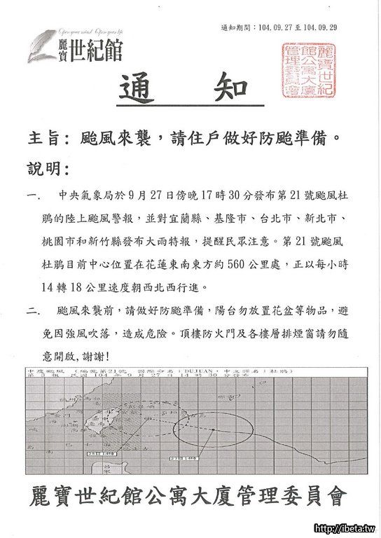 通知:颱風來襲,請住戶做好防颱準備